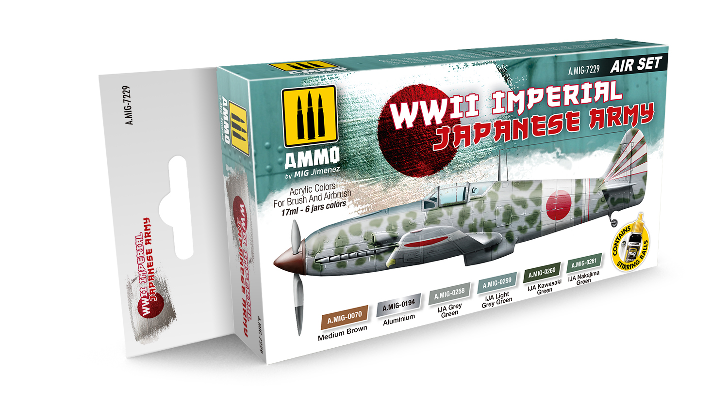 WW2日本陸軍機の塗料セットです。 水性アクリル塗料 17ml入り 6本セット 【セット内容】 A.MIG-0070 Medium Brown Dark Earth (BS 450) A.MIG-0191 Steel A.MIG-0258 IJA Grey Green A.MIG-0259 IJA...